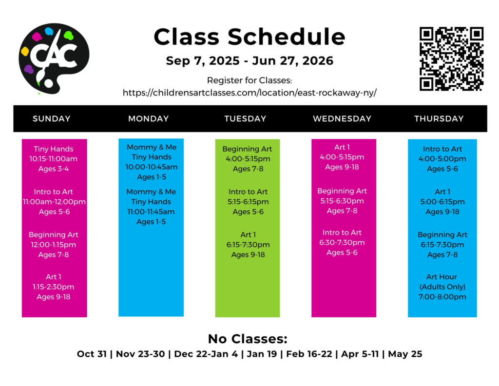 No Classes: Oct 31 | Nov 23-30 | Dec 22-Jan 4 | Jan 19 | Feb 16-22 | Apr 5-11 | May 25